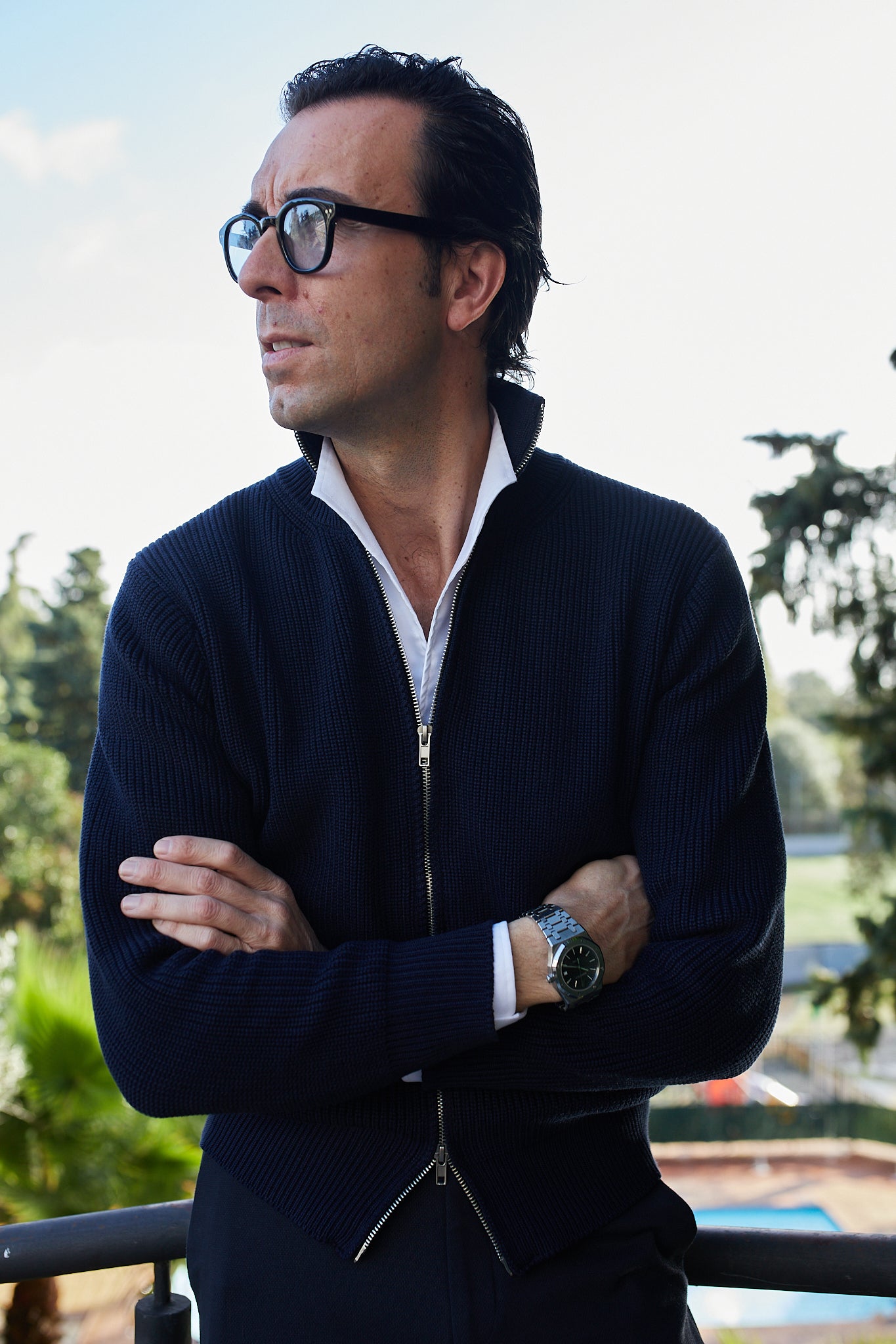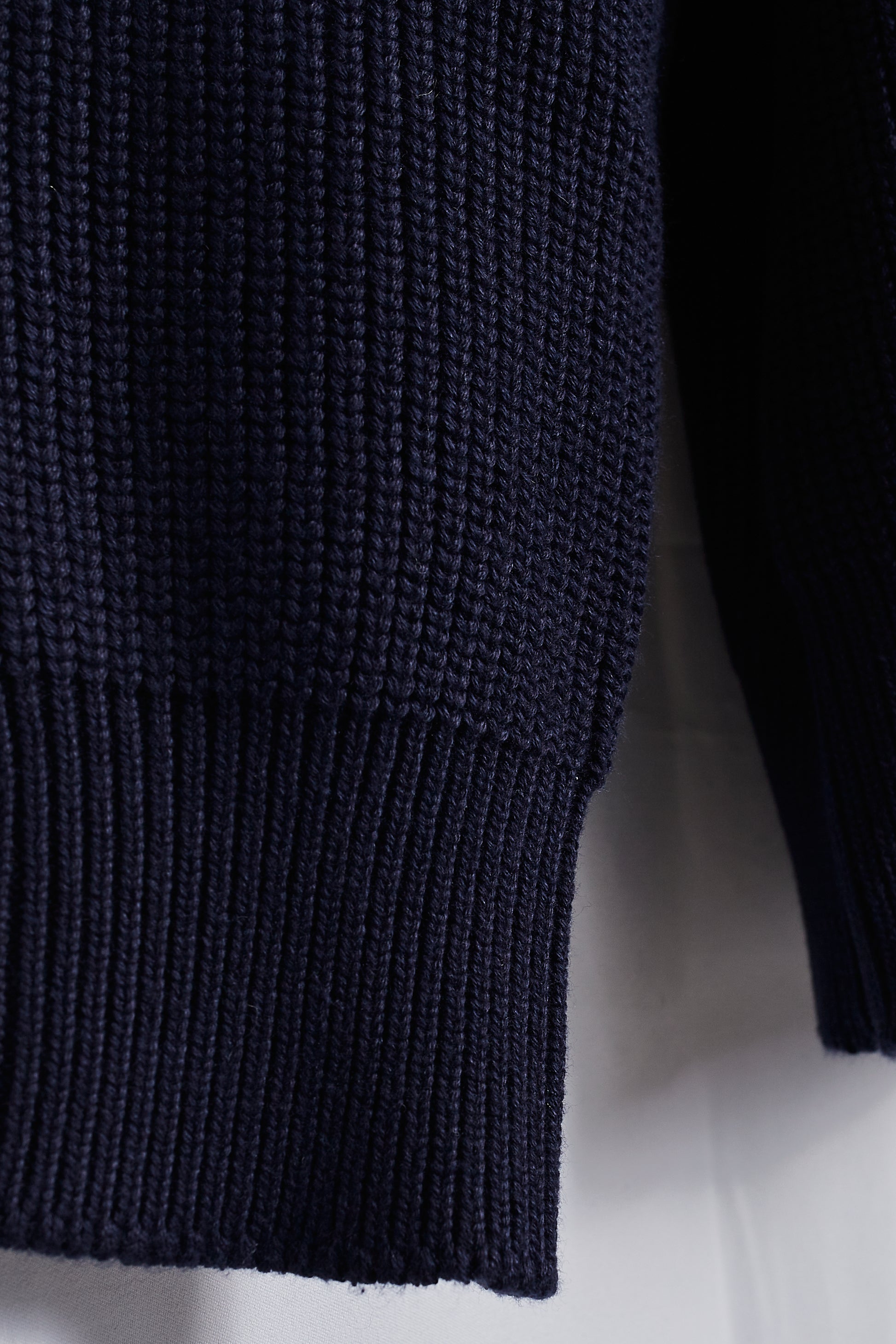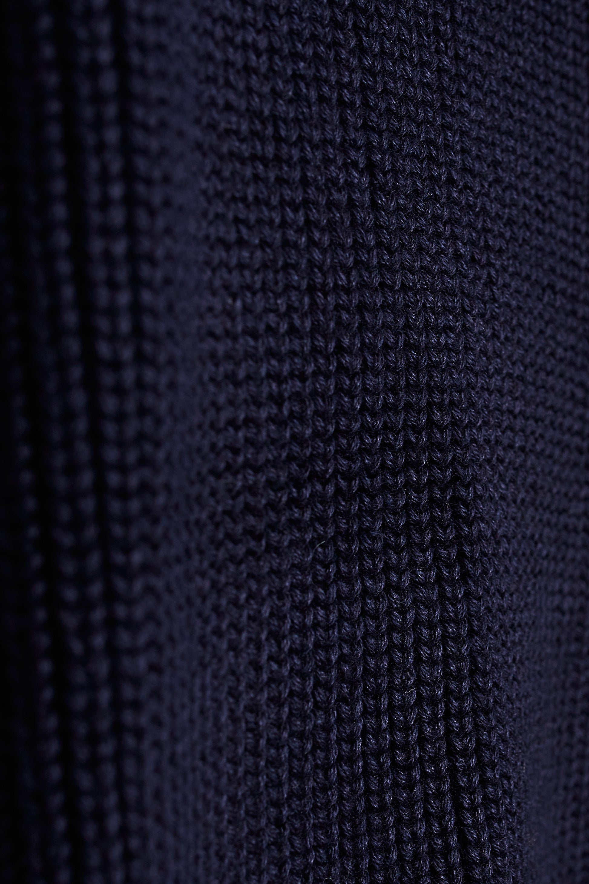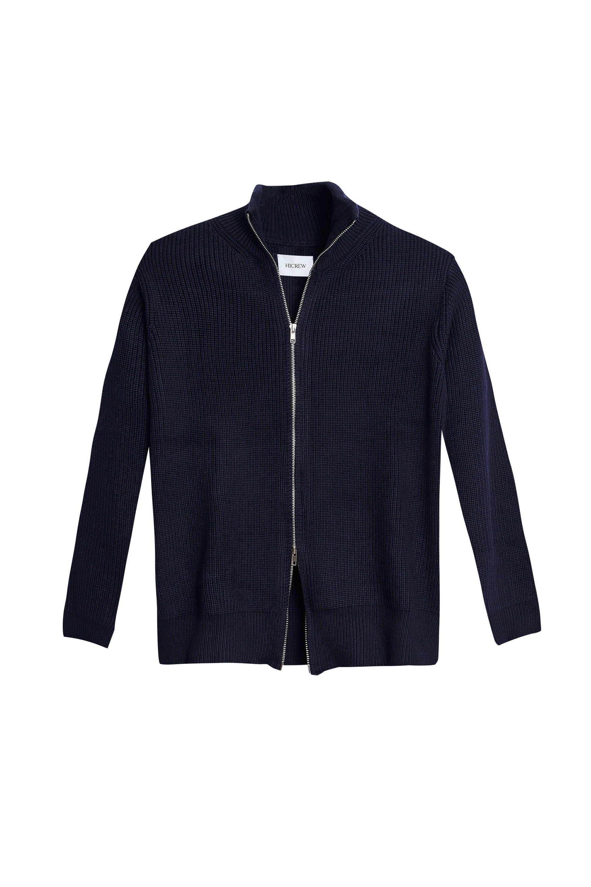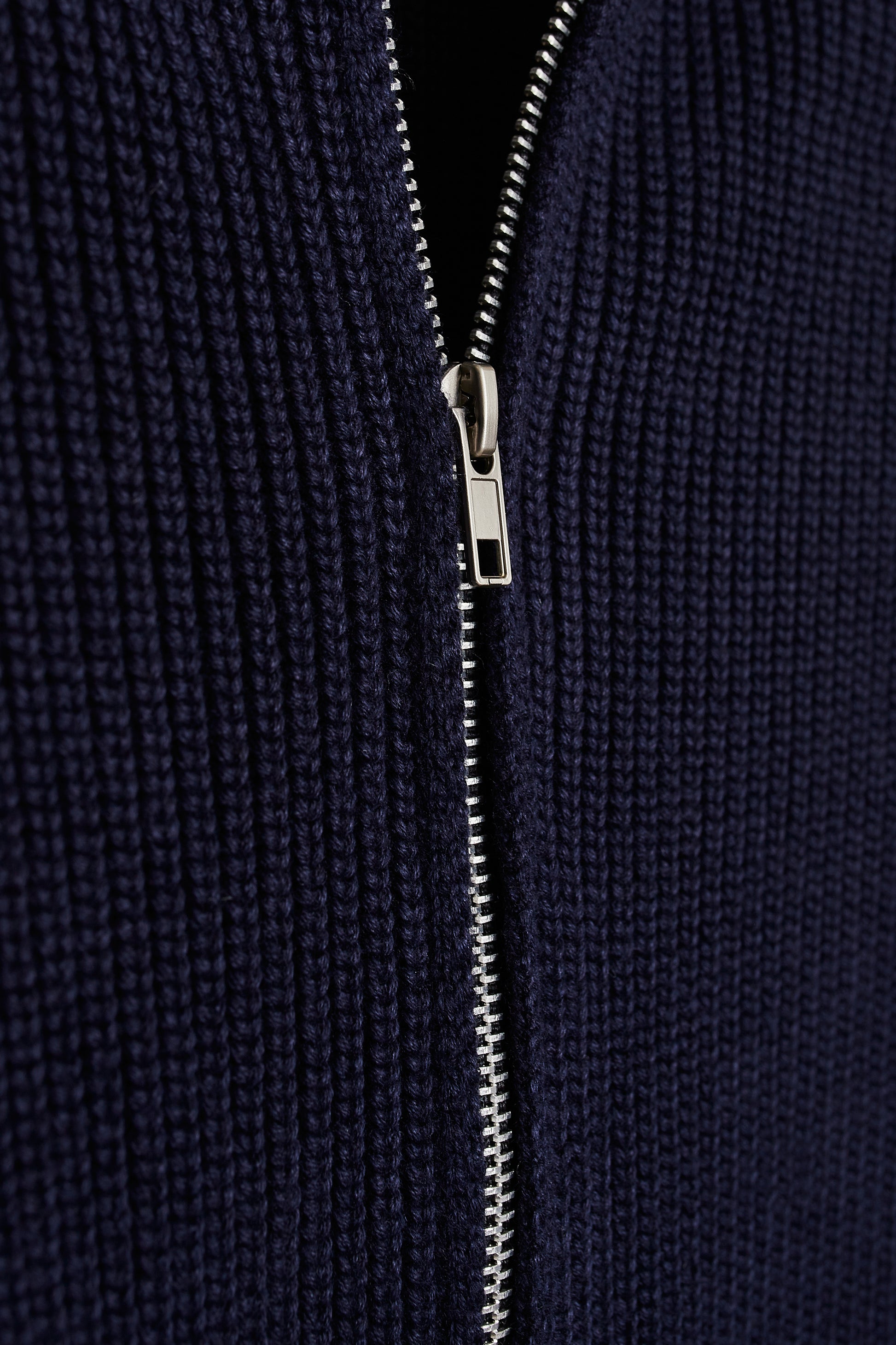 Cardigan de punto con cierre completo de cremallera de doble carril. Color azul marino. Una prenda pensada para ser versátil. Puede funcionar como chaqueta con un jersey fino debajo o como cárdigan con camisa o camiseta.