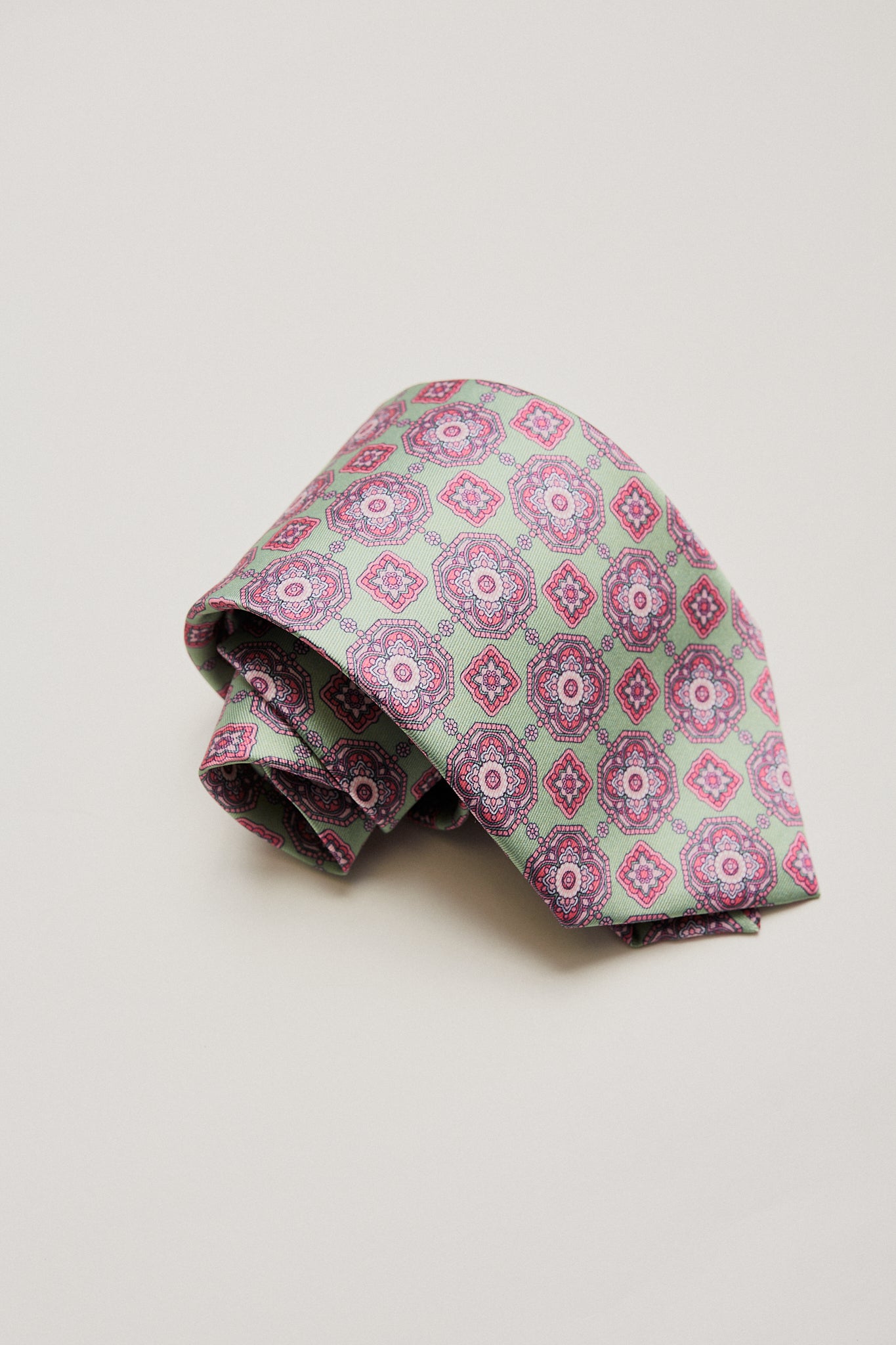 Corbata de 3 pliegues confeccionada totalmente a mano en Italia. Color verde suave con motivos geométricos.