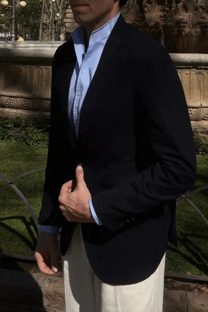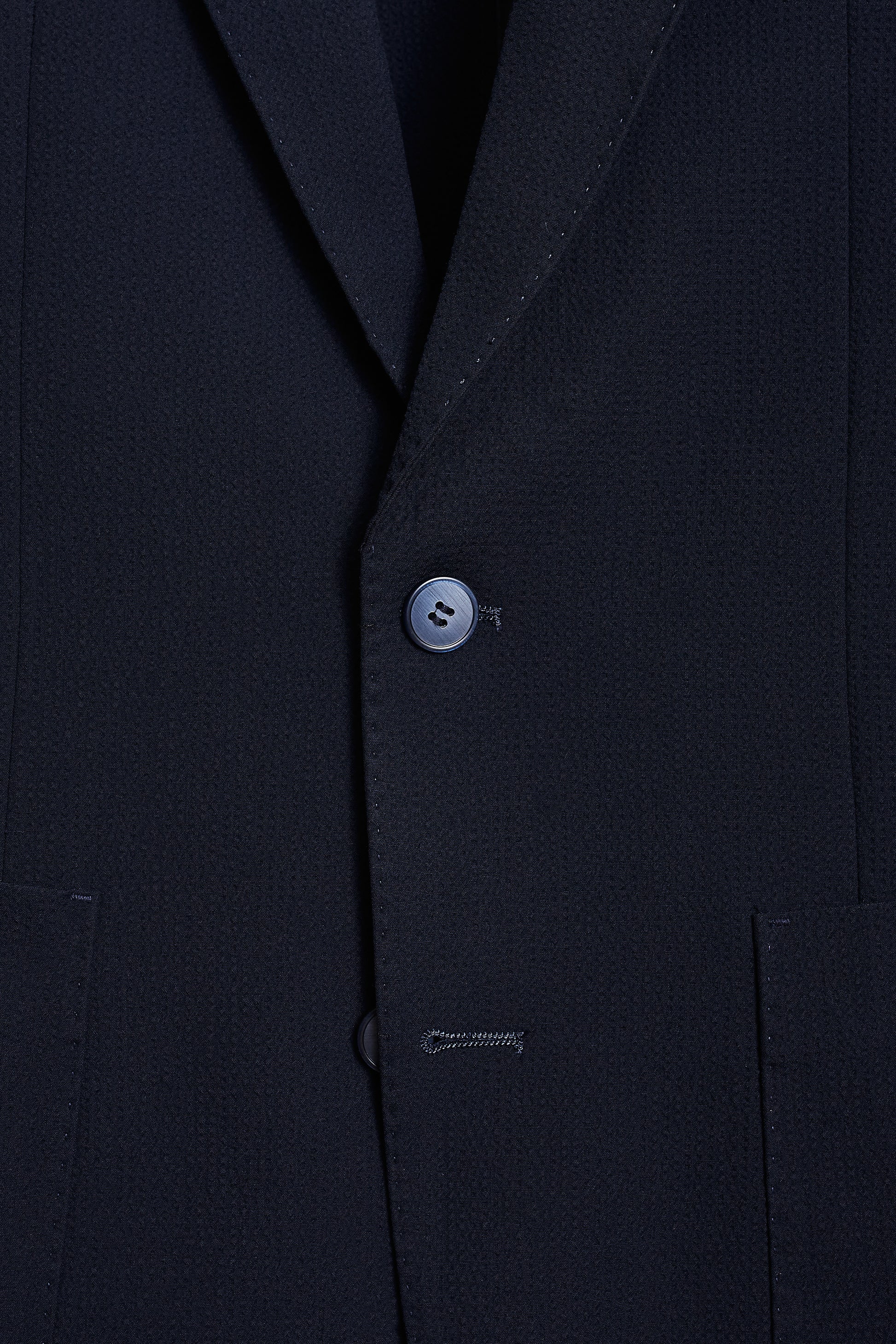 Americana confeccionada en 100% algodón seersucker con un patrón desarrollado por Hippie Crew®. Color azul marino. La versión romántica de la americana azul marino. Botones nacarados oscuros.