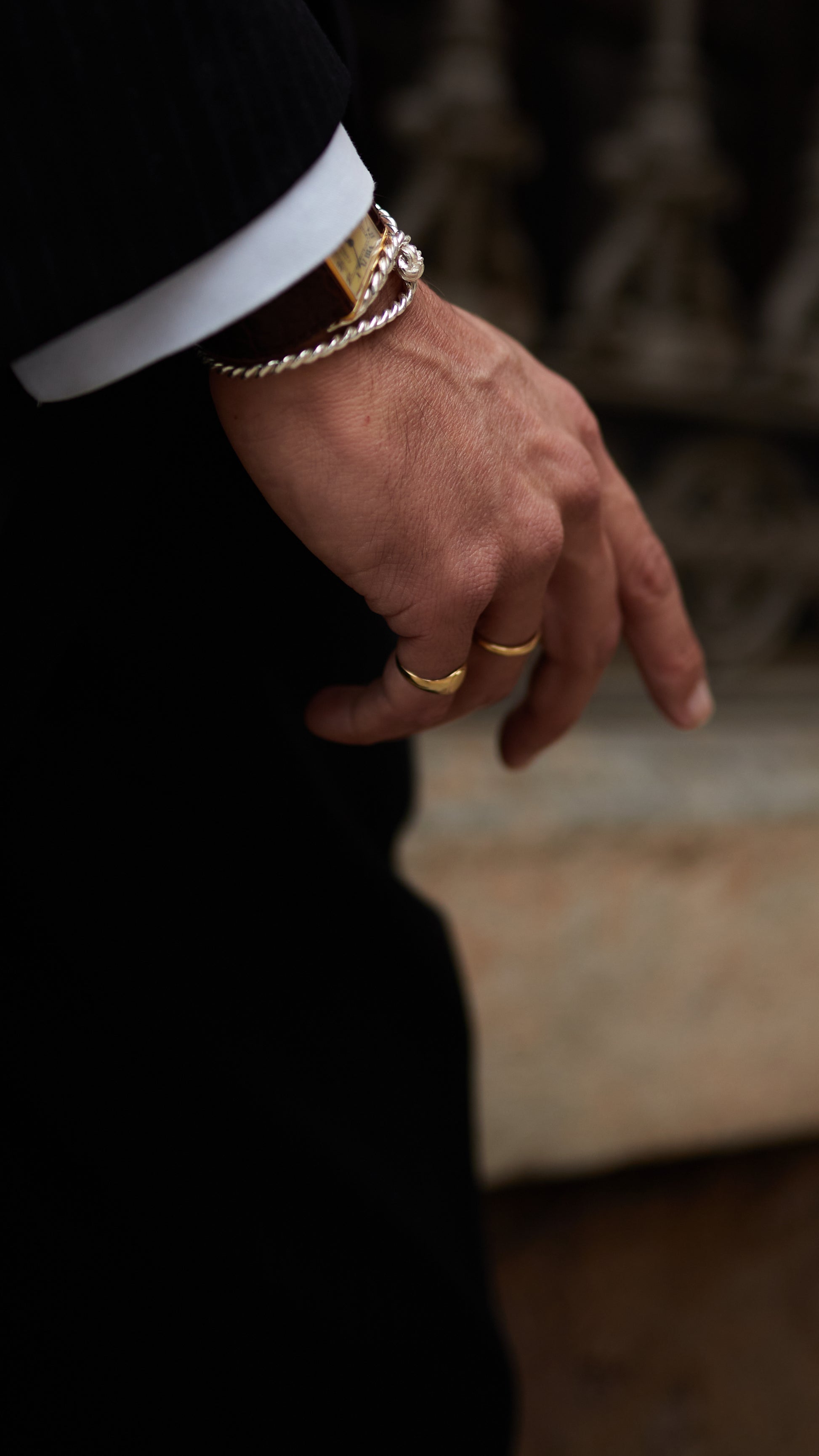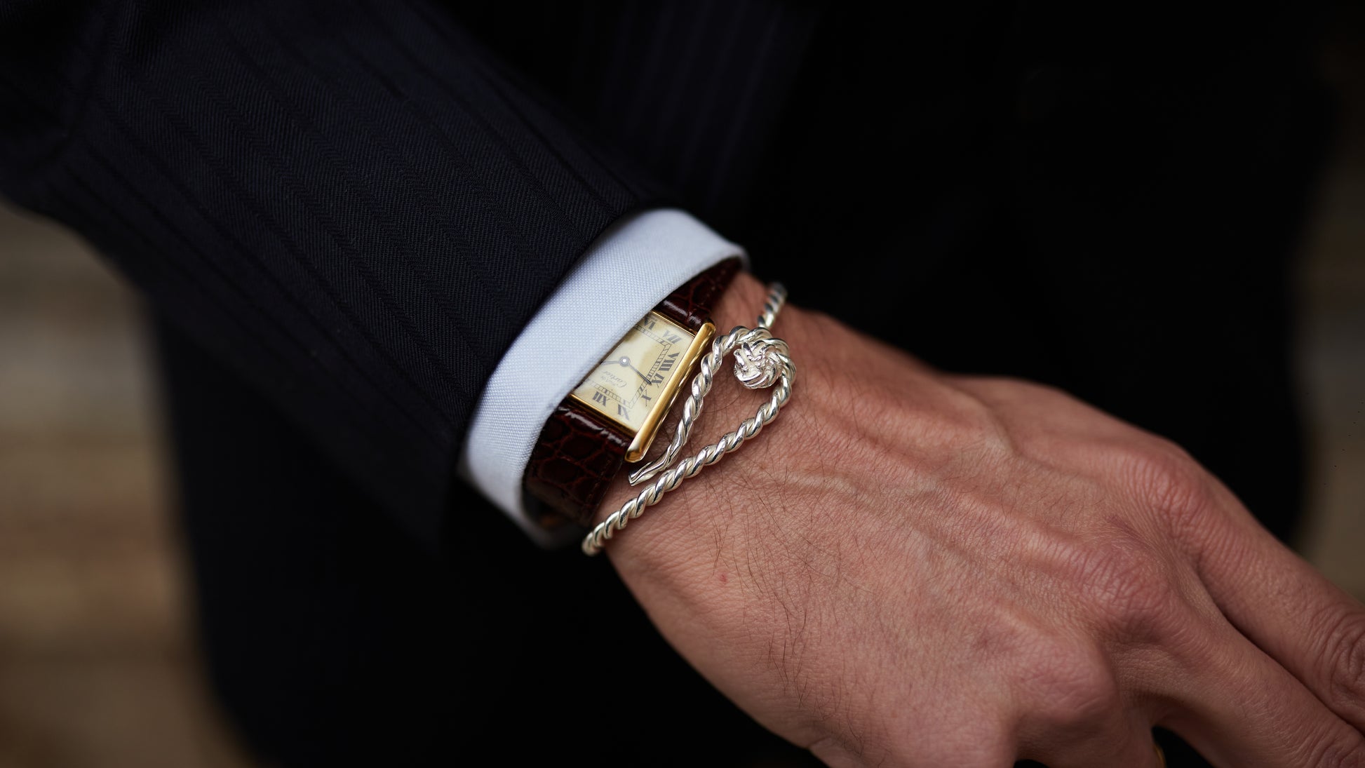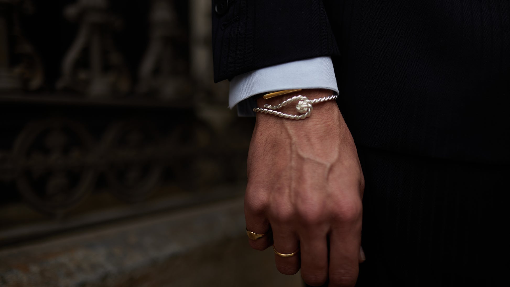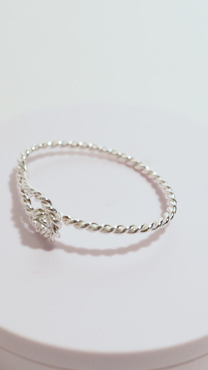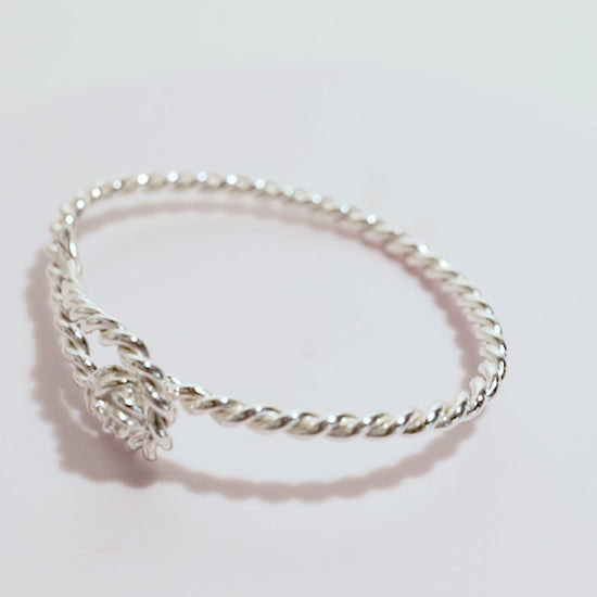 Pulsera de plata con formato caña rígida y acabado en espiral. Cierre fantasía con forma de lazo y nudo. Una obra de arte hecha a mano en tu muñeca.