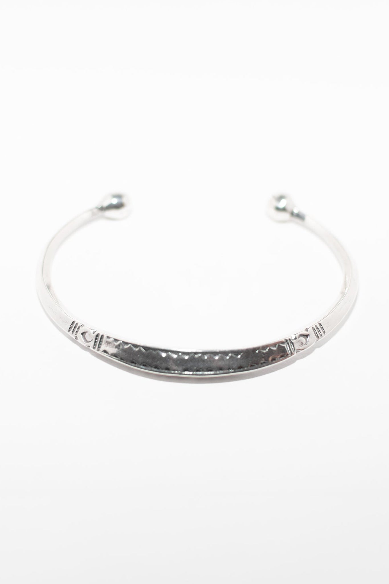 Pulsera - brazalete de plata 925 unisex con motivos tribales de inspiración senegalesa. Pulsera de plata que presenta un ensanche en sus proporciones en la parte central, asemejandose a la forma alargada de una semilla. La terminación de la pulsera tribal contempla una bola de plata maciza en cada uno de sus extremos, dando la posibilidad de usarla en dos modalidades diferentes.