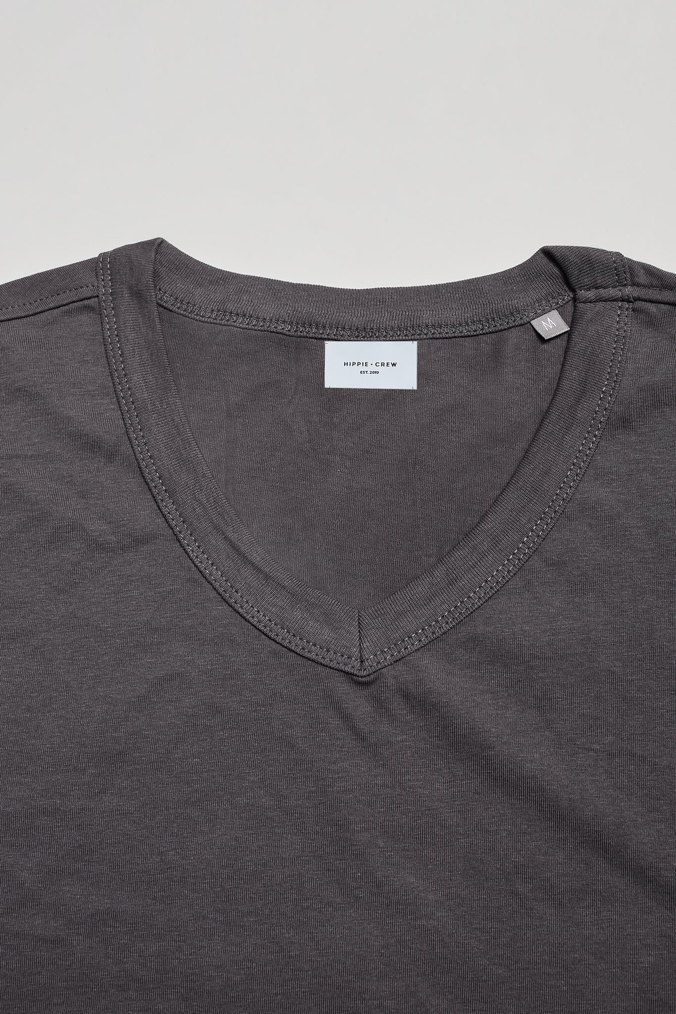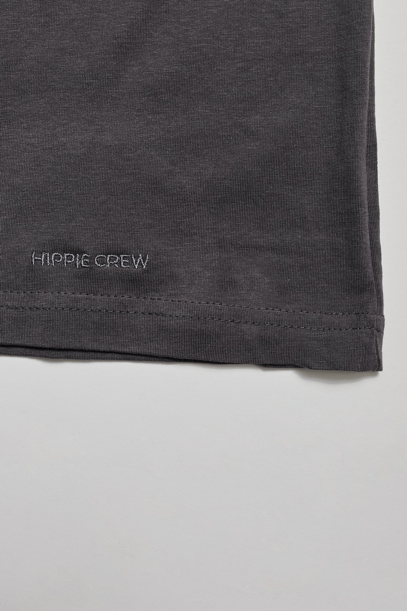 Camiseta color gris pizarra con bordado en la parte inferior. Cuello de pico. La camiseta ligera perfecta para los amantes de lo diferente. Tu toque Hippie Crew para el verano.