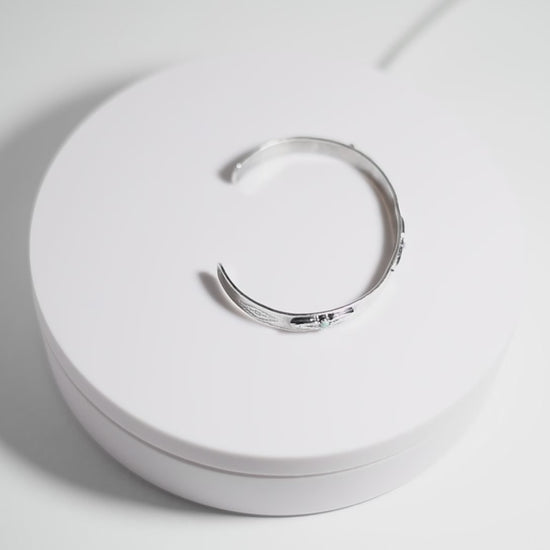 Pulsera unisex de plata 925 con formato brazalete de caña de 0,75cm de ancho con motivos de inspiración navajo. Lleva grabadas las iniciales de la marca en los extremos.
