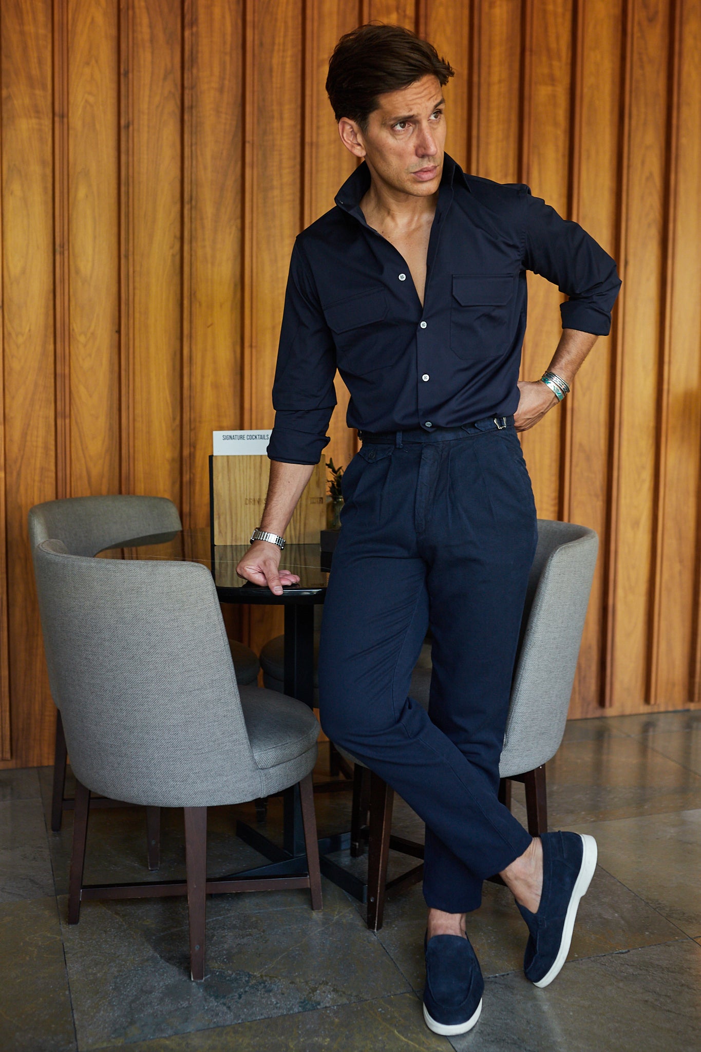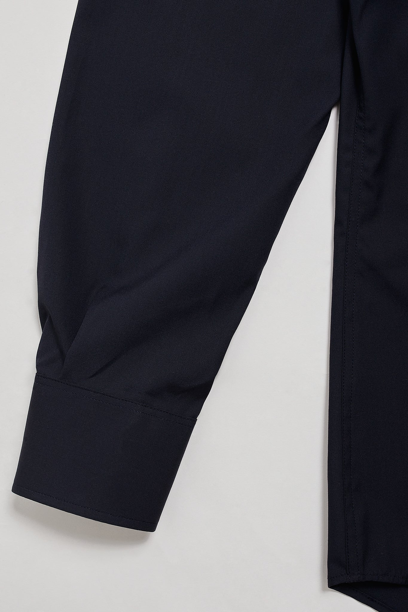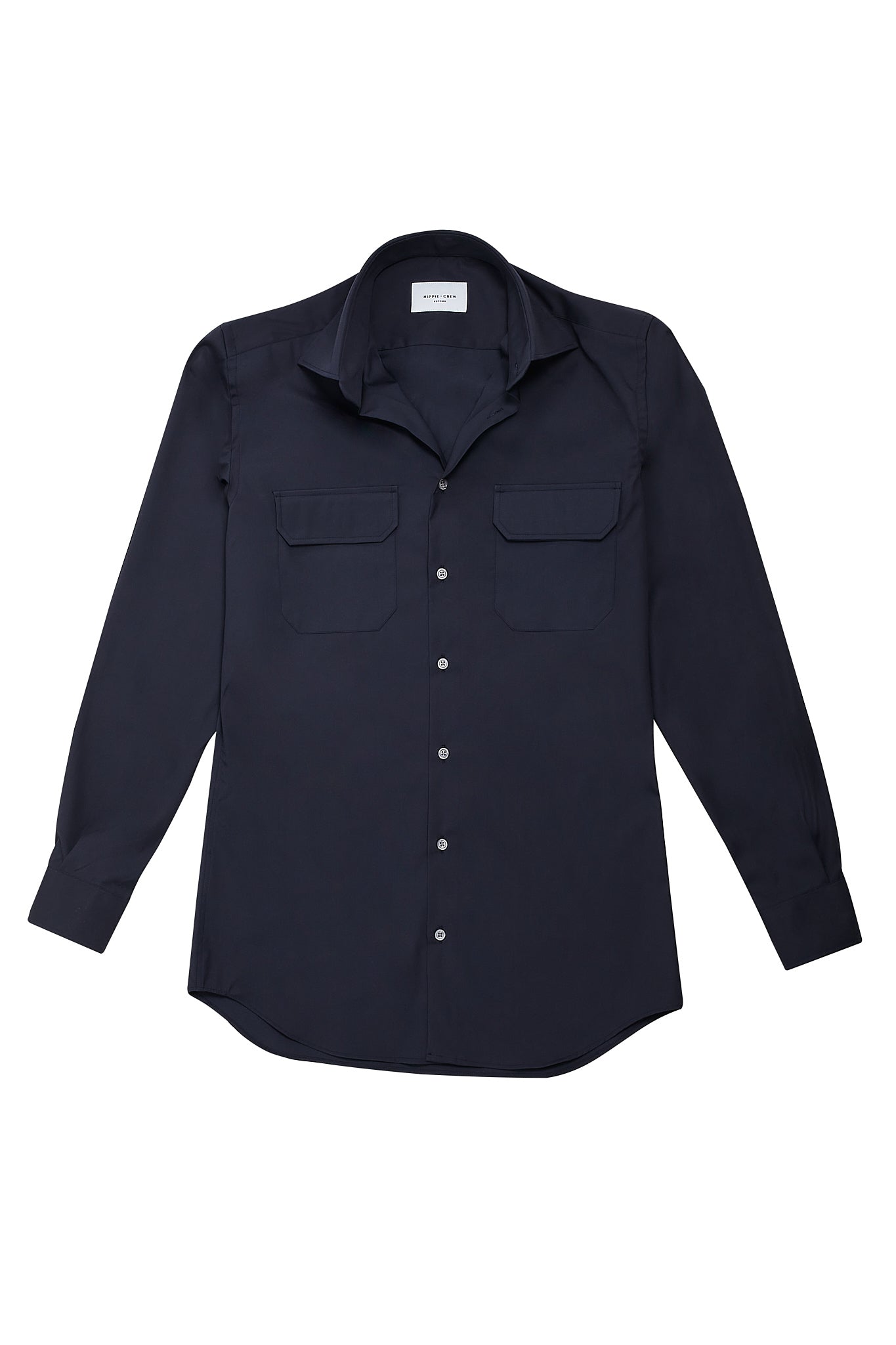 Camisa confeccionada en tejido travel de fácil plancha color azul marino. La opción ideal para llevar en la maleta o usar durante el viaje. Presenta cuello italiano con pala de 8cm. en el pecho.