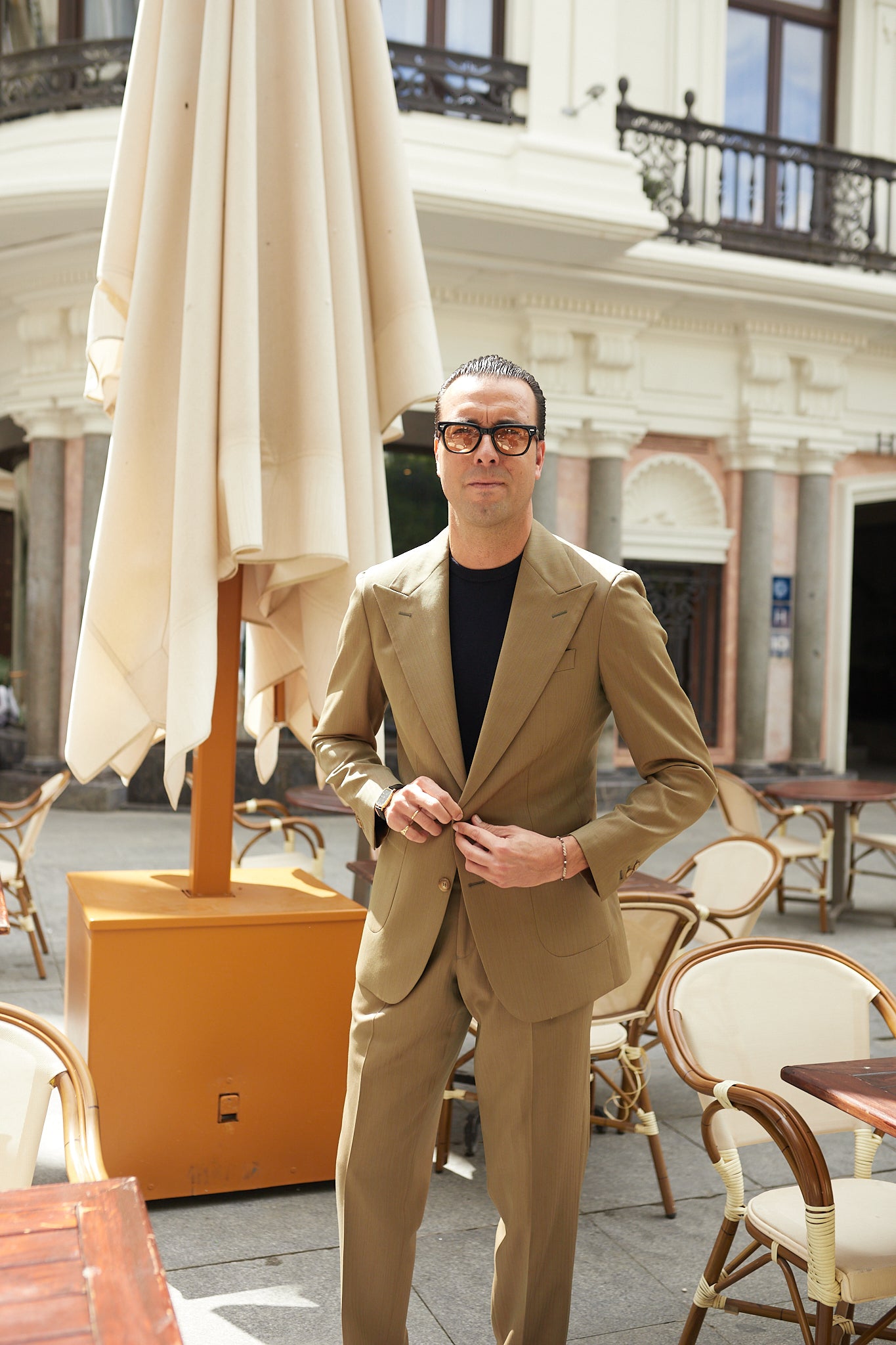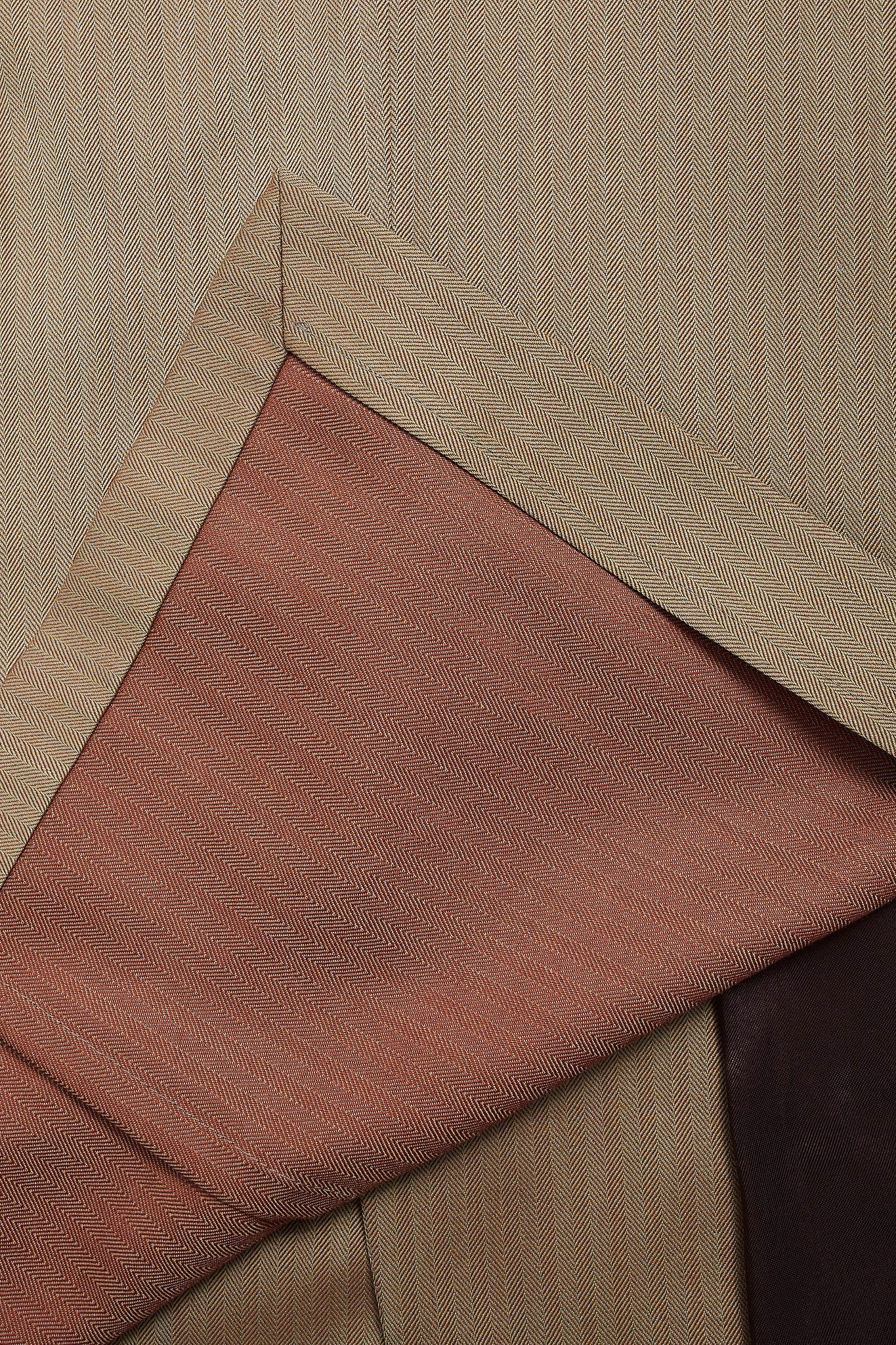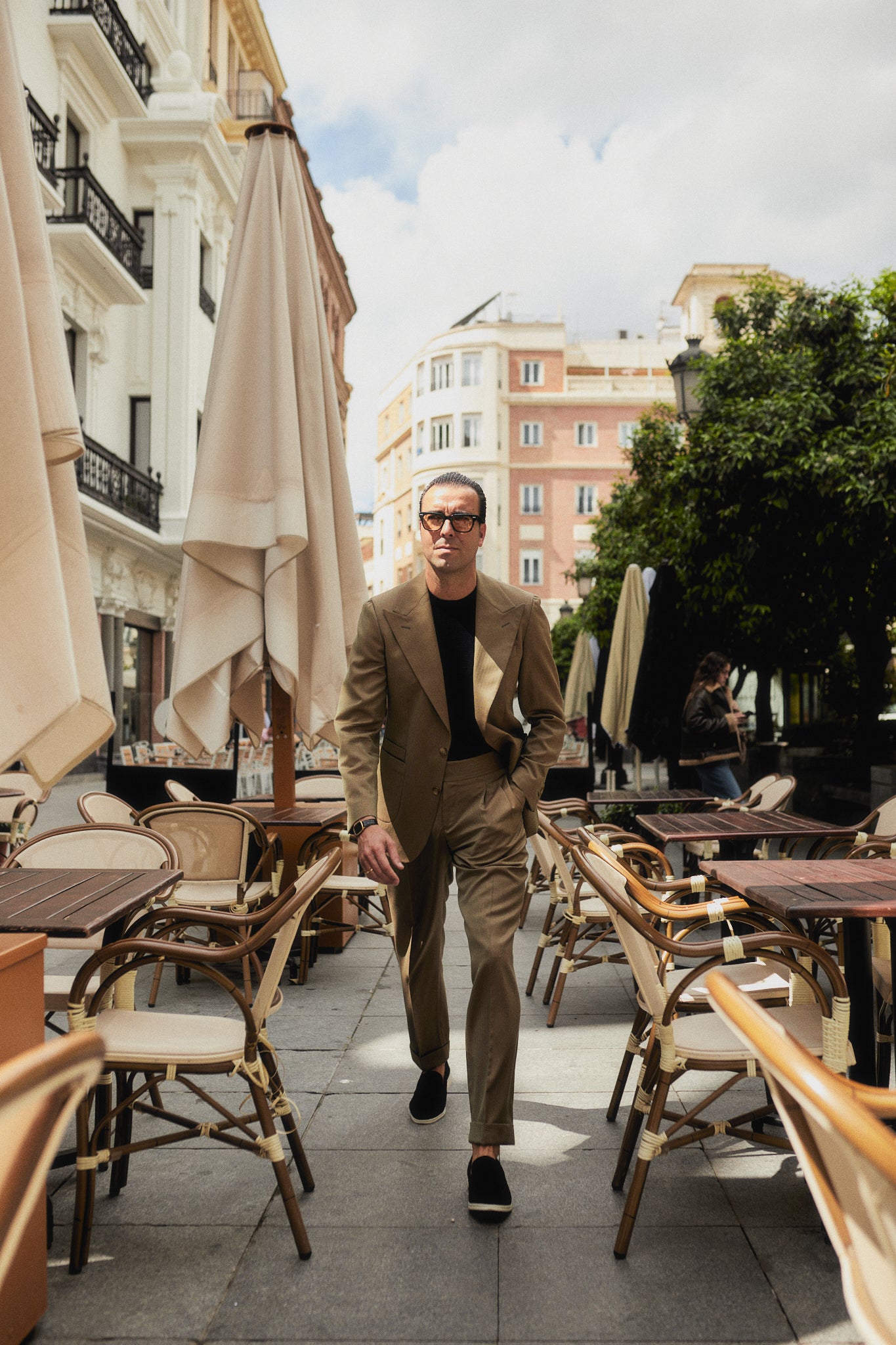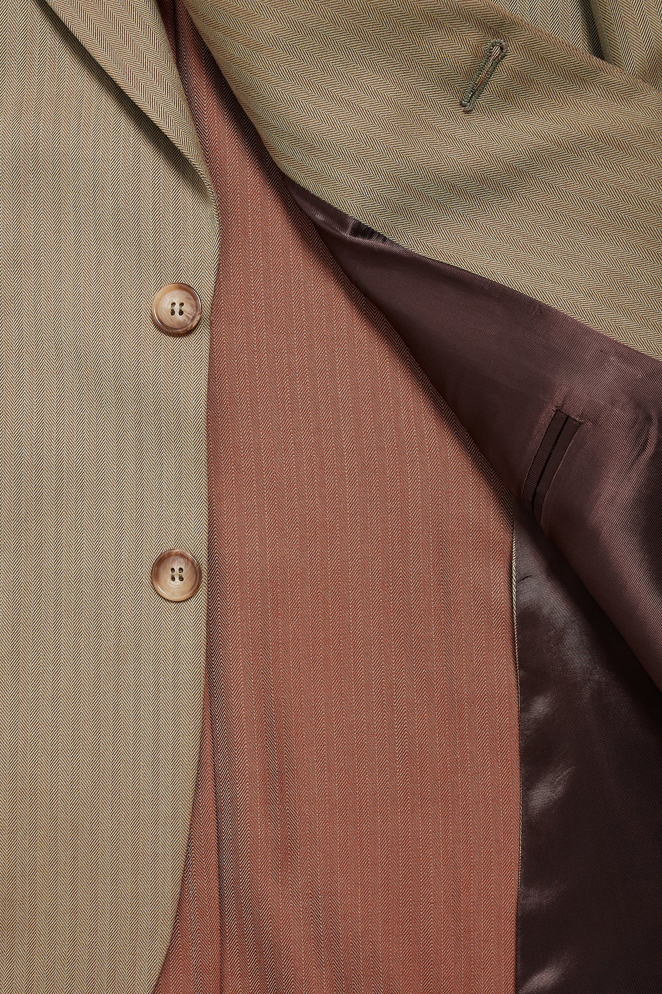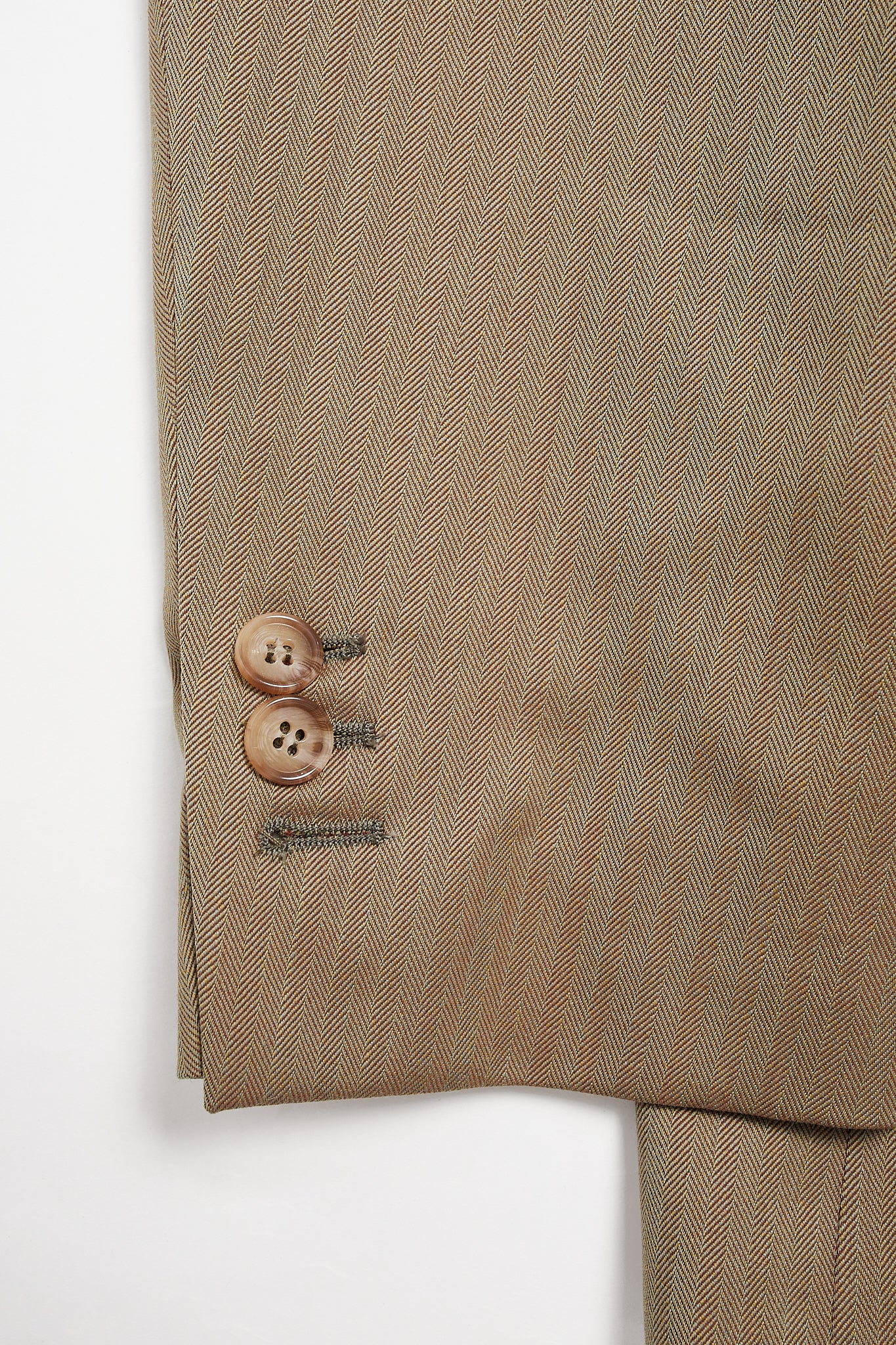 Americana de traje de dos botones confeccionada con un patrón desarrollado por Hippie Crew®. Color camel verdoso. El tejido Solaro es irisdicente y por tanto cambia de color según la luz.