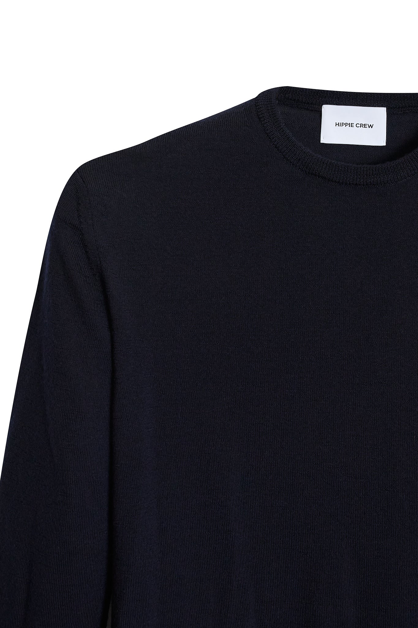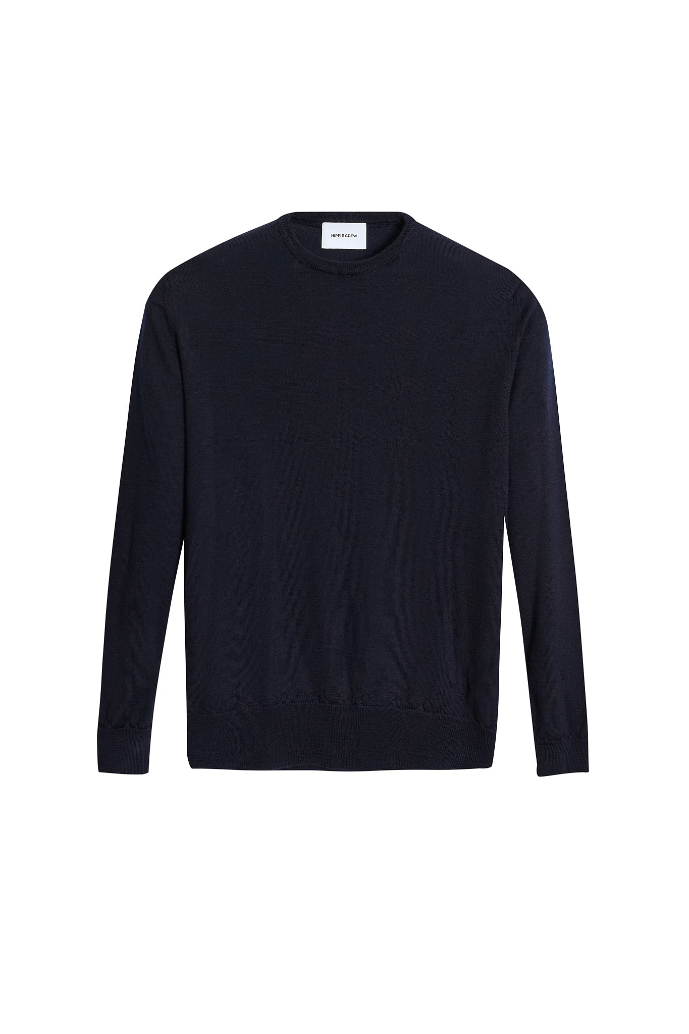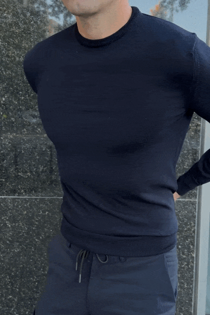 Jersey de lana merino italiana 100%, extrafino y con cuello redondo. Color azul marino. Perfecto para usar de una forma casual con camiseta blanca debajo o de una manera formal con camisa.