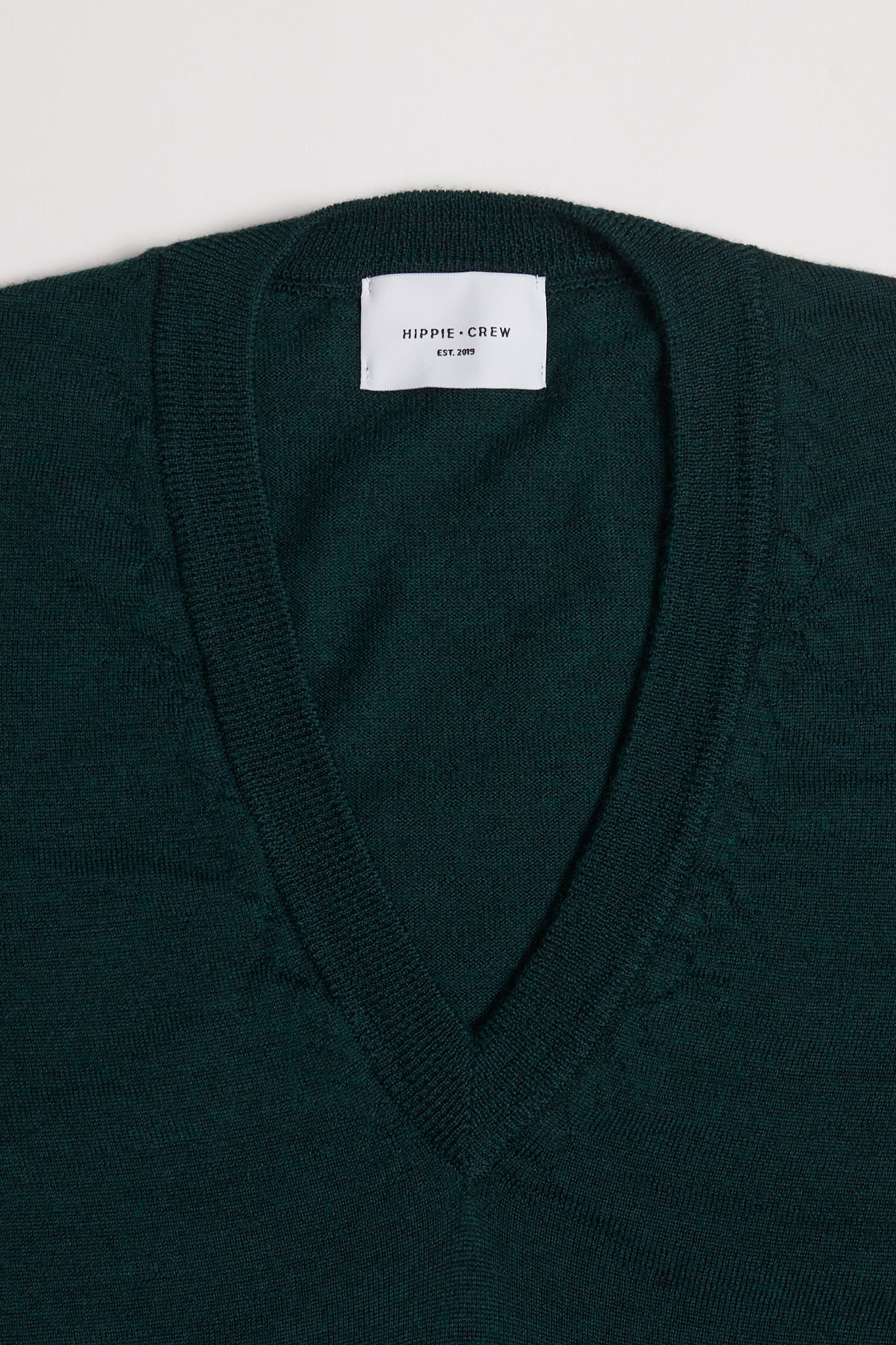 Jersey de lana merino italiana 100%, extrafino y con cuello de pico muy amplio. Color verde inglés. Una reinterpretación de los jerseys de pico de los años 70. Cuello muy bajo y rib grueso.