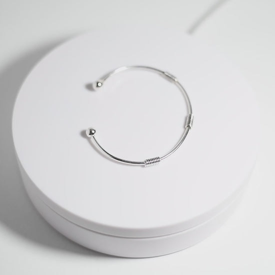 Pulsera de plata de ley 925 que combina esferas en los extremos distales y motivos espirales en la zona central. Un modelo que puede lucirse mostrando en la parte superior las bolas o los motivos de filigrana indistintamente. Dos opciones de lucirla para una pulsera.