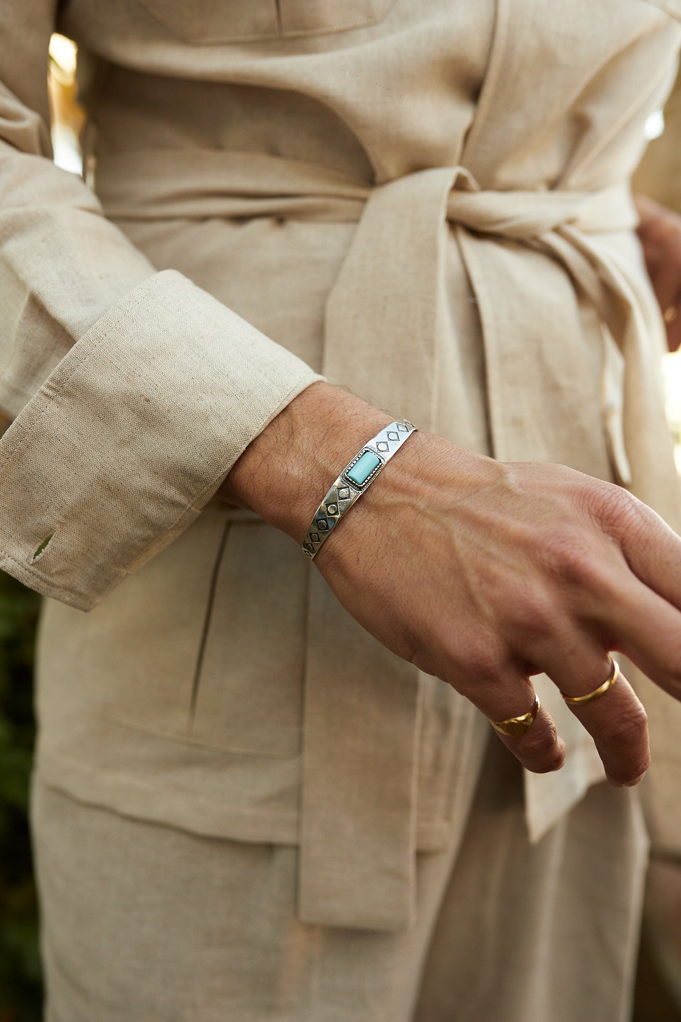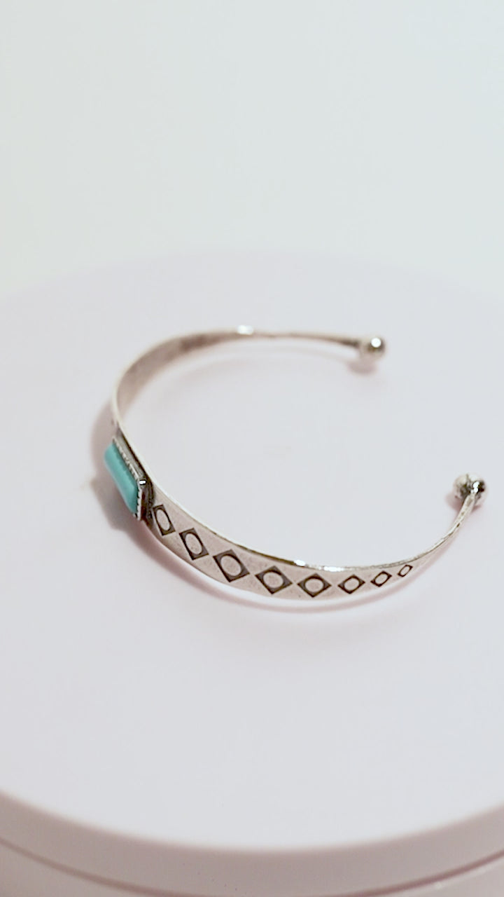 Pulsera de plata con formato brazalete de inspiración navajo con turquesa natural.